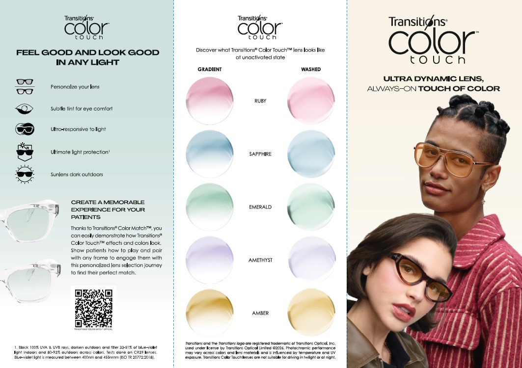 Use the static visuals featuring two frames that showcase both effects (washed and gradient) to let your patients know that you offer Transitions® Color Touch™ lenses. Inspiring!