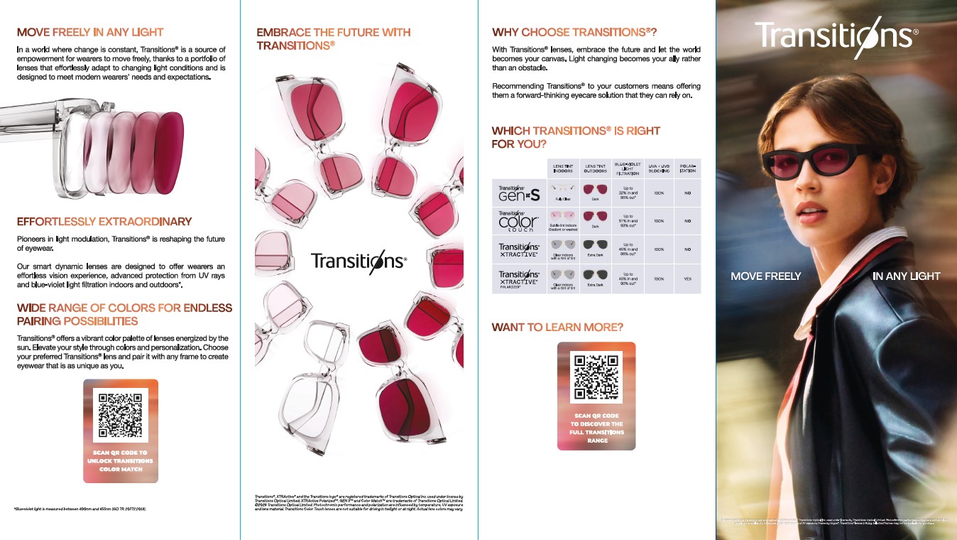 Our new “Patient” brochure provides a detailed overview of the complete Transitions® lens range: GEN S™, Color Touch™, XTRActive®, and XTRActive® Polarized™. It is designed to help you deepen your understanding of the Transitions® portfolio, providing key points to help you better present and convince your patients. QR codes will allow them to try out GEN S™ and Color Touch™ colors with any frame at your store or test their light sensitivity.
