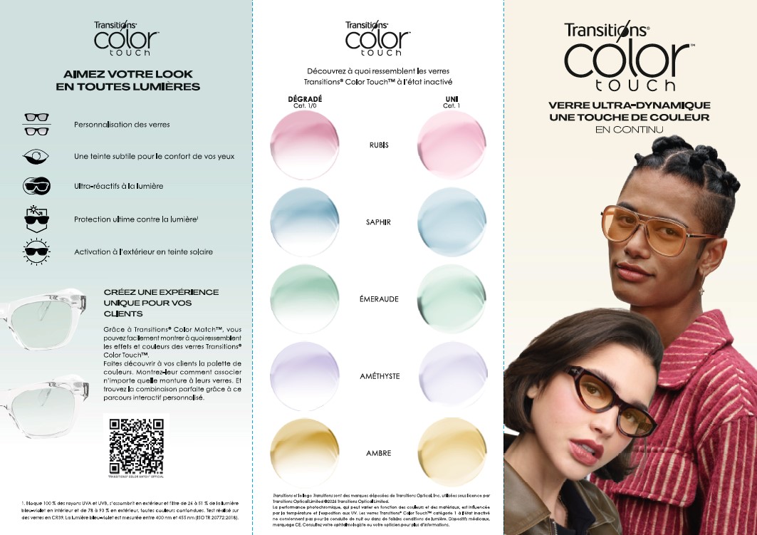 Elle vous présente en détails Transitions® Color Touch™: les 5 couleurs, les 2 effets, les avantages et les bénéfices pour vos patients, ainsi que quelques statistiques pour vous aider dans vos recommandations. Une brochure complète pour maitriser le sujet Color Touch™.