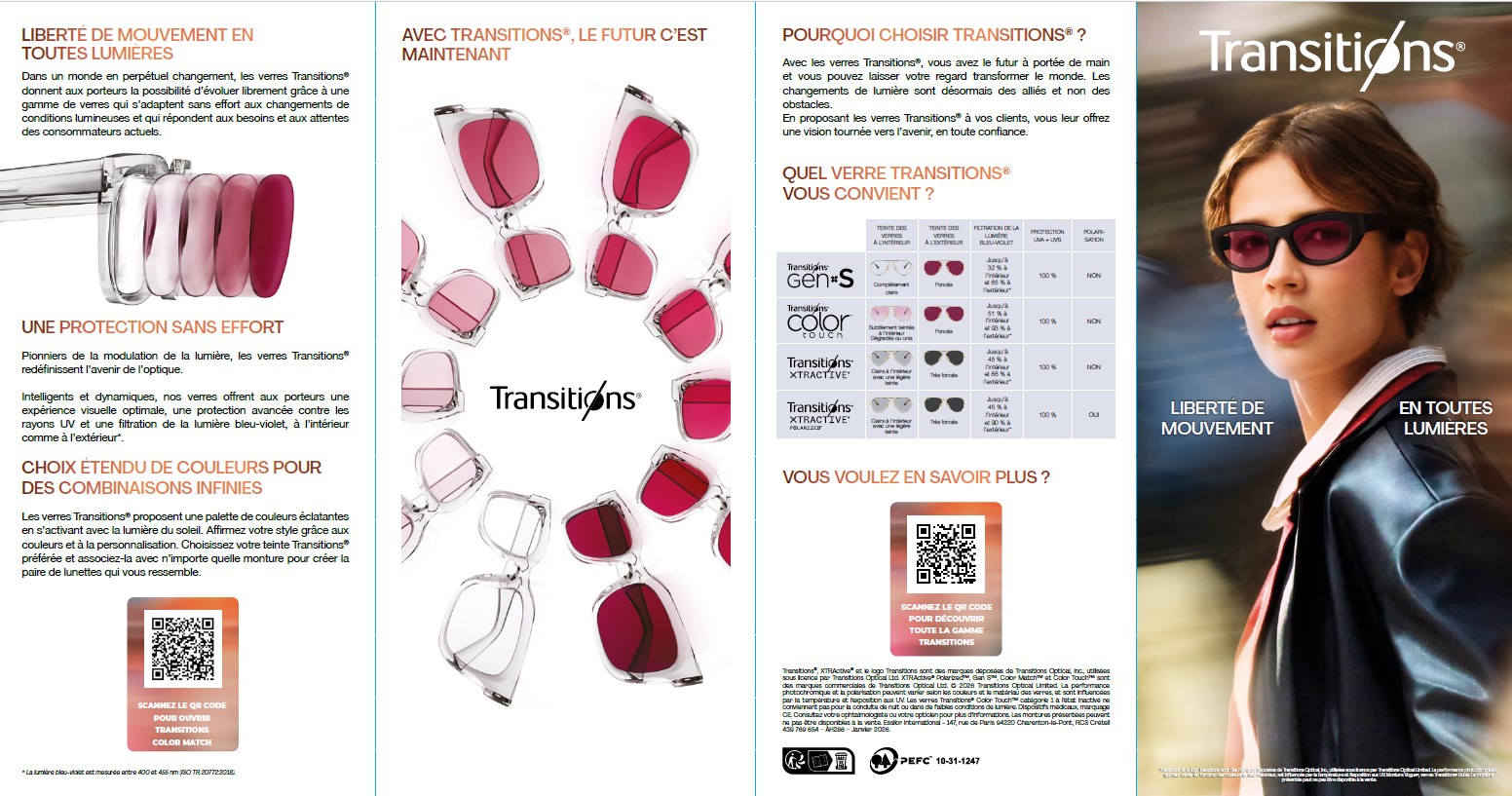 Notre nouvelle brochure ‘’patients’’ présente en détails la gamme complète des verres Transitions® GEN S™, Transitions® Color Touch™, XTRActive® et XTRActive® Polarized™. Elle est conçue comme un outil pour parfaire vos connaissances sur la gamme Transitions®, vous donnant ainsi des points clés pour mieux présenter et recommander Transitions à vos patients selon leurs besoins visuels. Les code QR permettront d’essayer les couleurs GEN S™ et Color Touch™ avec n’importe quelle monture de votre point de vente ou de tester leur sensibilité à la lumière. Vous trouverez beaucoup de réponses à vos questions sur Transitions® et vos patients aussi.